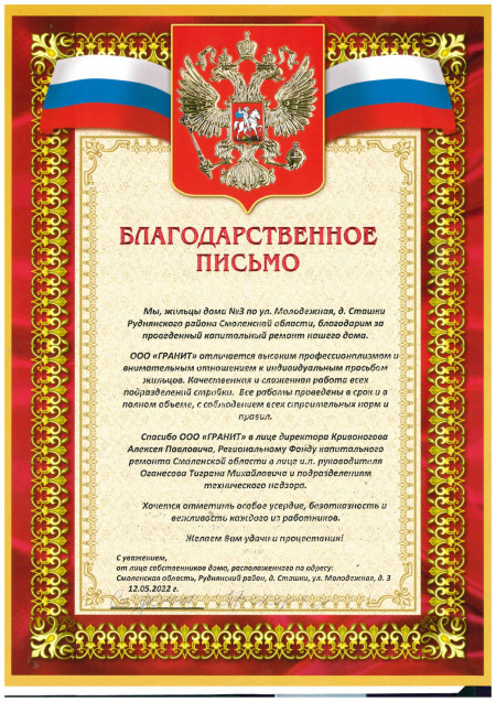 В адрес некоммерческой организации «Региональный фонд капитального ремонта многоквартирных домов Смоленской области» поступило благодарственное письмо от жильцов многоквартирного дома № 3 по ул. Молодежная в д. Сташки Руднянского района Смоленской области. Собственники довольны работой подрядной организации, выполнившей капитальный ремонт крыши.