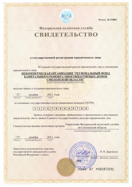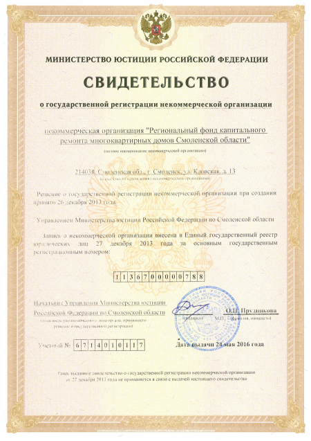 Свидетельство о государственной регистрации некоммерческой организации