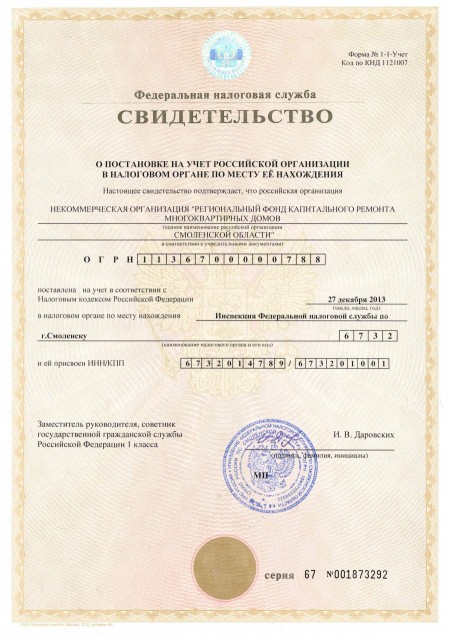 Свидетельство о постановке на налоговый учет российской организации